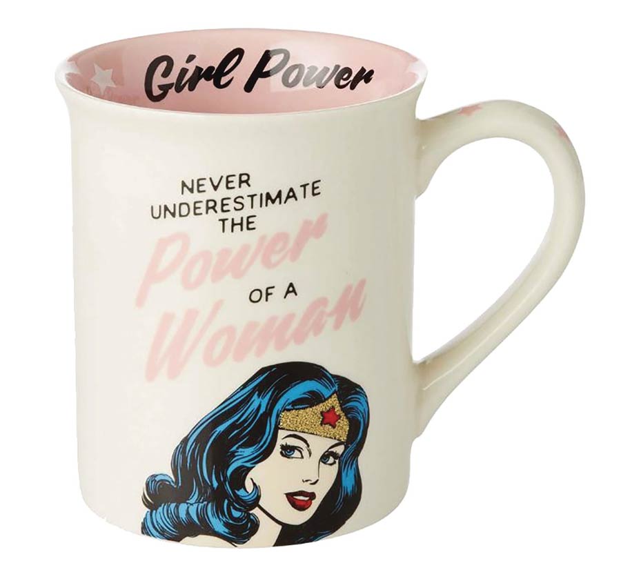 From Our Name is Mud. Never underestimate the power of any woman with this DC Comics Wonder Woman 16 oz stoneware mug with detailed glitter accents. Show everyone who has the girl power. High-quality materials are handwash recommended and not microwave safe (due to glitter accents). Mug ships in a decorative gift box.