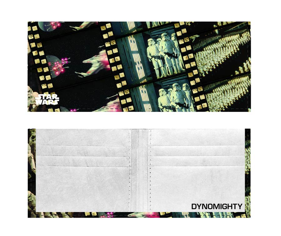 From Dynomighty Design. The new alternative to the standard old leather wallet, make a positive step towards sustainable design with a Star Wars Dynomighty Billfold. Utilizing a classic leather wallet configuration yet with the unique benefits of Tyvek to make a wallet that is thinner lighter and stronger than a regular leather wallet. Each Dynomighty Billfold has a large pocket for cash and many of the standard leather wallet compartments and storage areas. Engineered to be thinner, lighter and stronger than a standard leather wallet you can easily use any security door pass or electronic transit system without opening your wallet allowing you to stay on the go. Choose from Darth Vader Profile or Star Wars Film.