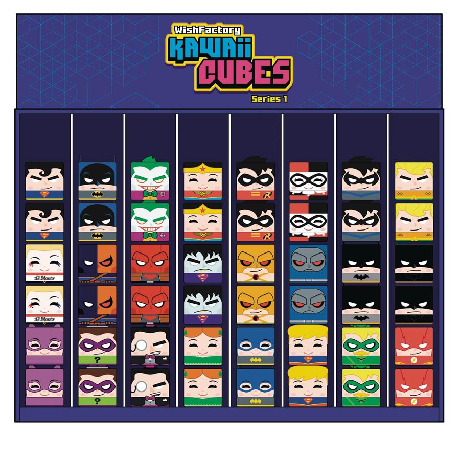 From Wish Factory. Kawaii, a term that denotes cuteness within the context of Japanese culture, is now a prominent feature of Japanese popular culture. Kawaii Cubes are a completely different - and completely adorable - twist on favorite licensed characters. Taking a basic geometric shape, the cube, as its form, the Kawaii Cubes inspire creativity and play, plus their shape makes storing them convenient through stacking. Offered in a variety of styles, Kawaii Cubes will be released in limited quantities, making them collectible and sought-after. Utilizing the familiar characters from Warner Brothers and DC Comics, the Kawaii Cubes' cute style will introduce these characters to the next generation while also becoming a unique collectible that long-time fans will seek out and cherish. This gravity feed display of 2" x 2" small Kawaii Cubes includes 72 plushes in the following breakdown: Aquaman (x3), Batman (x8), Catwoman (x3), Harley Quinn (x6), The Joker (x6), The Penguin (x3), Robin (x3), Wonder Woman (x6), Batgirl (x4), Nightwing (x3), The Flash (x6), Green Arrow (x3), Poison Ivy (x3), Supergirl (x4), Superman (x7), and Green Lantern (x6).
