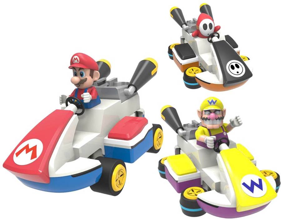 From K'NEX. K'NEX lets you bring your favorite Nintendo game to life with the Mario Kart Building Sets. These sets includes all pieces you'll need, plus step-by-step instructions, to construct your very own character and kart from the game, then race him around for fun, action-packed and creative play. If that hasn't revved up your imagination, the box that these sets come in double as a launch ramp for another dose of fast and fun racing action! Set is perfect for builders ages 6 and up. Collect Mario, Shy Guy, and Wario.