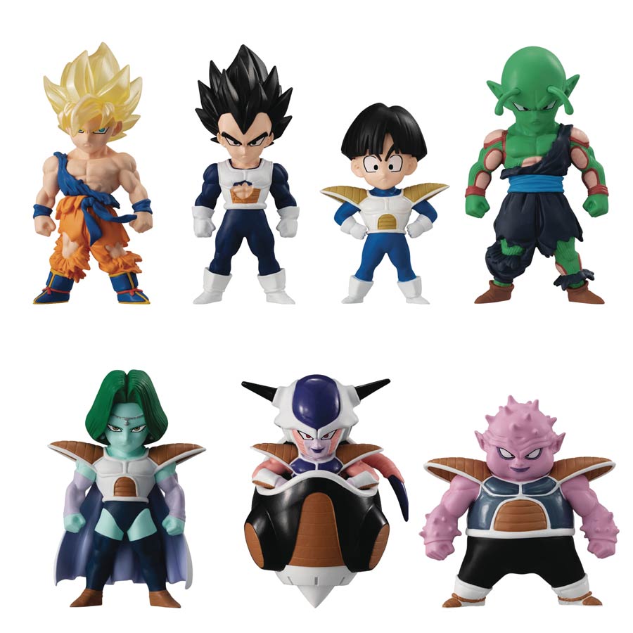 From Bandai Shokugan. The 13th volume of popular Dragon Ball Adverge series features the familiar characters from Dragon Ball Z! Approximately 1.97" tall static figures in standing pose. Assortment of seven characters includes: Super Saiyan Son Goku, Vegeta, Son Gohan, Piccolo, Zarbon, Frieza (in first form) and Dodoria.