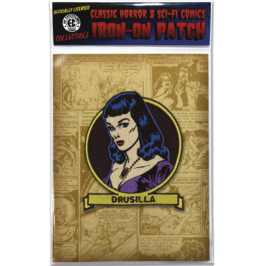 From Retro-A-Go-Go. Beware! She's got a cold dead stare and is sizing up your blood type. The original gothic vampire girl, Drusilla, was the last of the EC Horror Hosts to be introduced toward the end of their run. This patch measures approximately 3 3/8' wide x 4" tall. Each patch is carefully placed onto heavy card stock backer with fun EC Comics branded header card packaging.